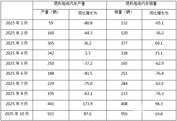 表1,根据中汽协数据,2025年10月燃料电池汽车产量同比统计: