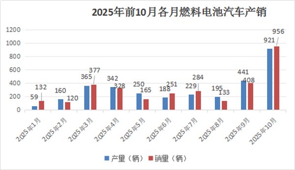 上表可见,2025年10月燃料电池汽车产销分别为921辆和956辆,同比分别增长87.6%和69.8%,产销量同比均跑赢2025年10月新能源汽车产销大盘。扭转了之前几个月均是跑输新能源汽车大盘的窘境,据分析主要是去年同期销量基数太低,加之到年底了,部分企业为了完成年度任务,开始冲量。