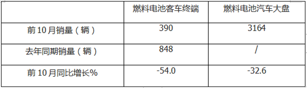 特点四、前10月电池电池客车终端销售390辆,同比下降超5成,跑输燃料电池汽车大盘