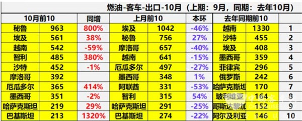 截图2,2025年10月我国燃油客车出口TOP10国销量同环比及排行