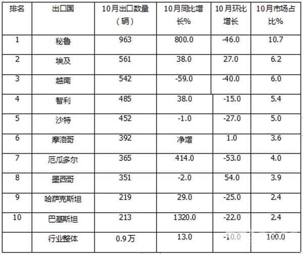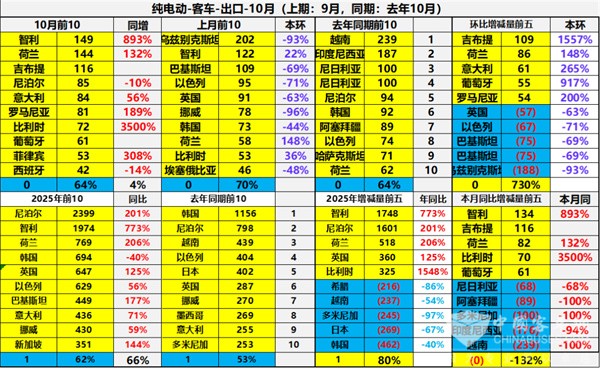 上表显示,2025年10月我国客车出口到TOP10国家中,出口数量同比及市场占比: