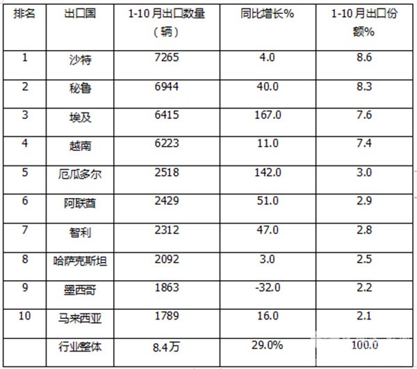 上表显示,在2025年1-10月我国客车出口国TOP10中,出口数量、同比及市场占比: