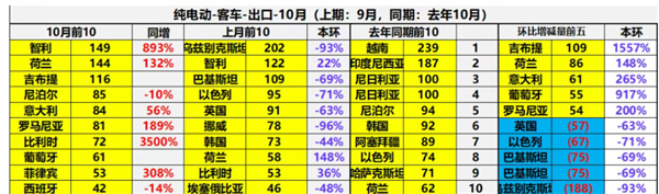 四、10月纯电动客车出口国:智利\荷兰\吉布提居前三;前10同比8增2降,比利时增35倍领涨
