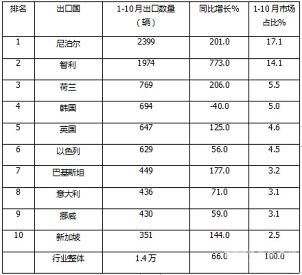 10月客车出口国:智利\荷兰\吉布提居纯电动前三