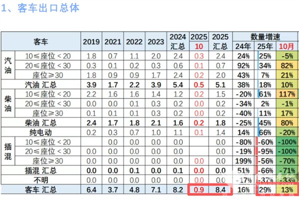 根据中国汽车流通协会提供的海关数据,2025年10月我国客车出口0.9万辆,同比增长13%;2025年1-10月我国客车累计出口8.4万辆,累计同比增长29%(见截图1)。