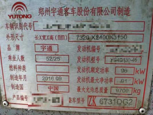 | 客车品牌 | 宇通客车 | 上牌时间 | 2016-09-23 |