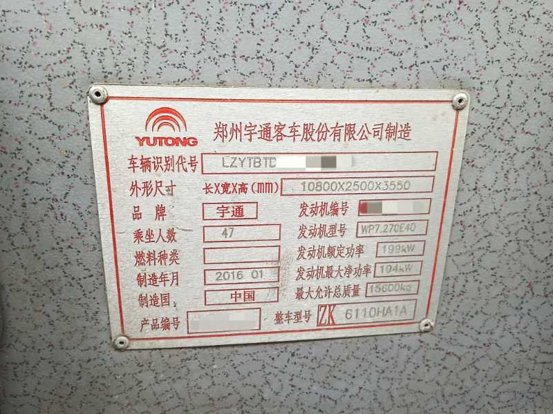 | 客车品牌 | 宇通客车 | 上牌时间 | 2016-01-25 |