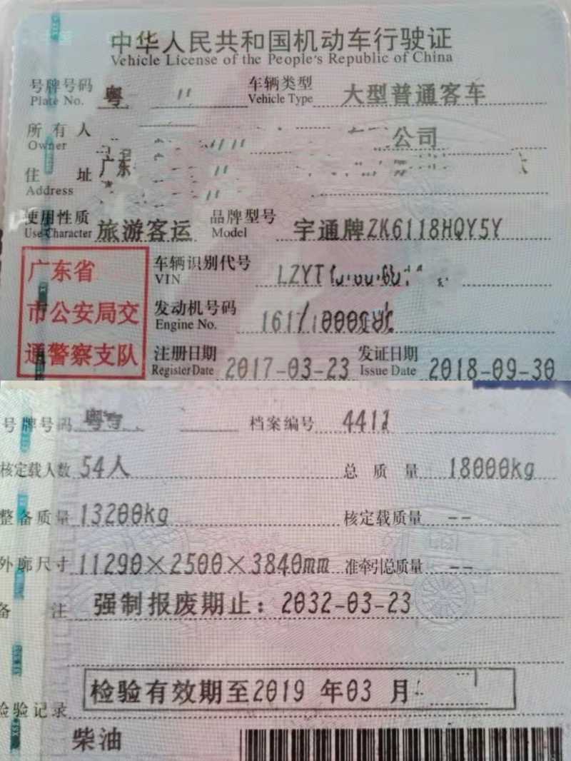 2017年3月 国五54座正规营运档案四轮碟刹宇通6118气囊车