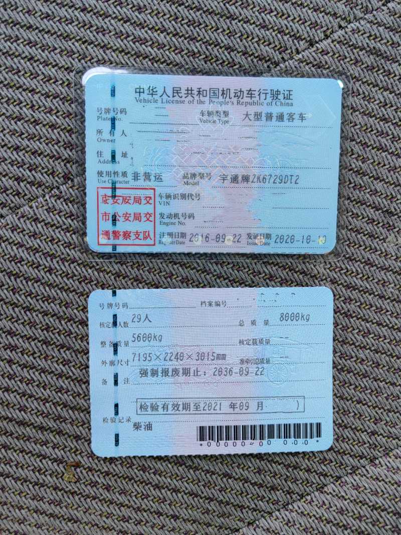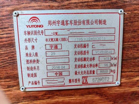 2016年6月上牌宇通6729型,29座,玉柴140发动机,前碟后鼓,有缓速器,带行李架,封闭窗,外摆门,非营运性质。