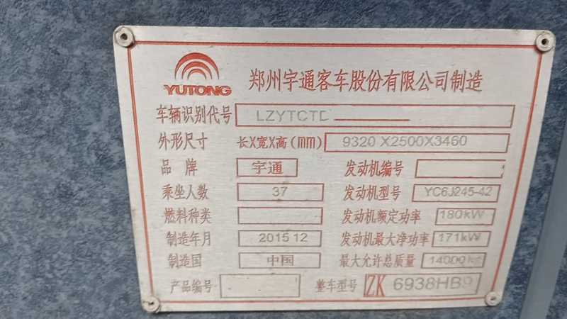 国四37座宇通营运车2016年早产一天的宇通上牌宇通6938型气囊车,2015年12月29日上牌,有中门,缓速器,可调座椅,行李架,通仓,玉柴245机头。