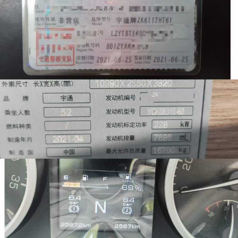 2021年6月 三台同款国六52座非营运宇通6117准新气囊车