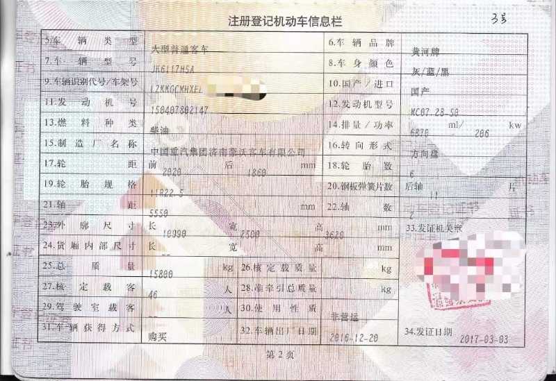 | 客车品牌 | 黄海客车 | 上牌时间 | 2017-03-16 |