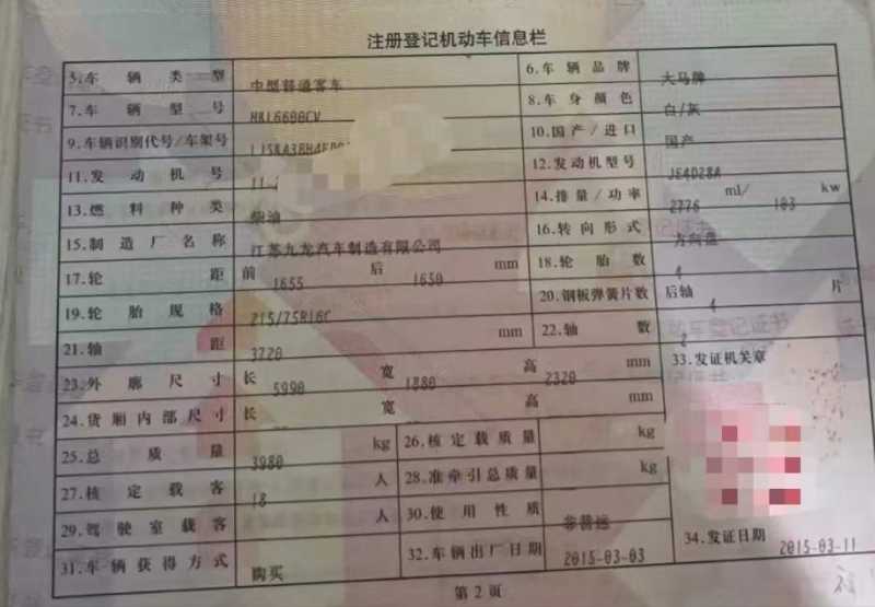 | 客车品牌 | 九龙客车 | 上牌时间 | 2015-03-18 |