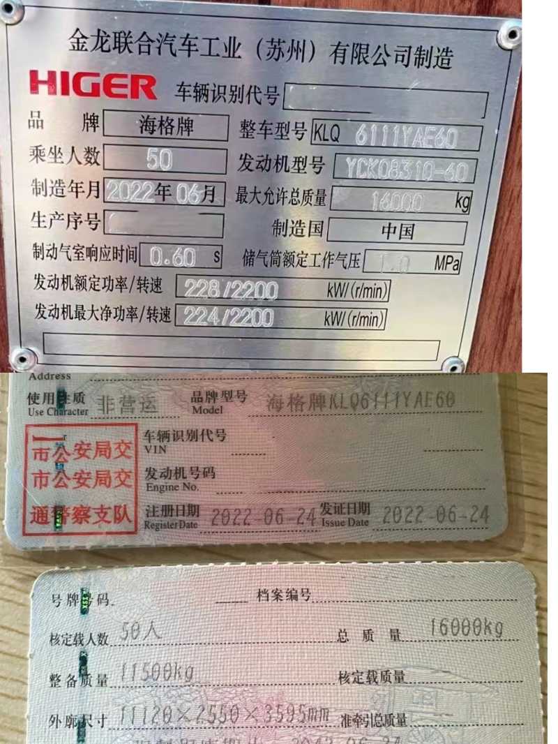 非营运国六50座海格2022年6月上牌海格6111,玉柴310机头,表显不到5万公里,前碟后鼓,钢板减震,通仓,木纹地板,有中门+安全门,有暖气,电加热,松芝空调,泰勒玛缓速器,法斯特波箱。