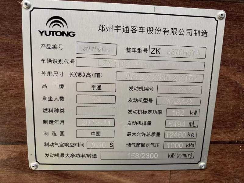 | 客车品牌 | 宇通客车 | 上牌时间 | 2019-12-12 |