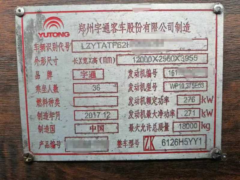 | 客车品牌 | 宇通客车 | 上牌时间 | 2017-12-27 |
