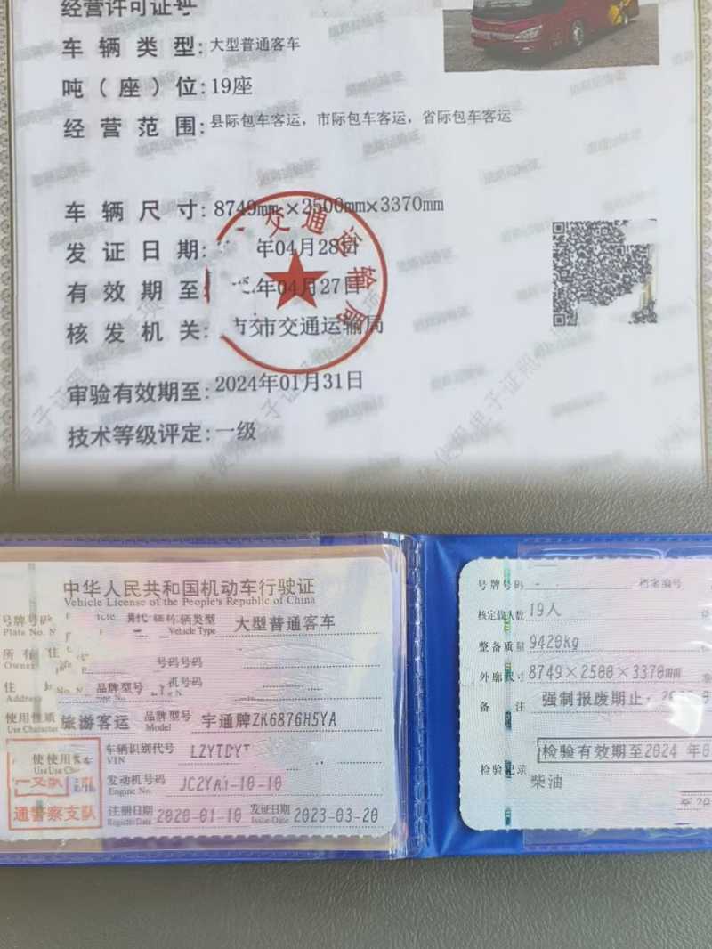粤牌国五19座2+1宇通6876保姆车,2020年1月上牌,气囊车,航空座椅、高铁窗帘、带缓速器、玉柴6缸220机头、旅游客运、六条新轮胎、随时看车提档过户。