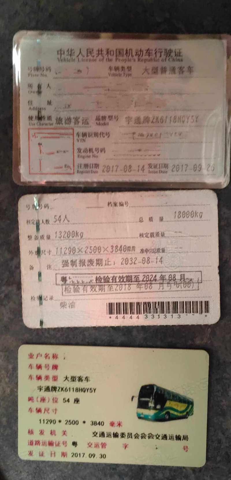 来台粤牌国五 54 座宇通 6118旅游车 ,2017 年 8️上牌,气囊车,玉柴 330 发动机,中门,前碟后鼓,上移行李舱,司机卧铺,旅游客运市级省级包车大型高一级营运证,可提营运,同款还有一台2016年国四54座,接受置换。