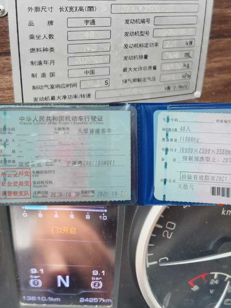 又来天然气国六LNG48座抢手宇通6119营运车,2020年10月,YMK300国六机头,气囊车有中门,行李架,通舱,才几万公里,有公告,旅游客运性质可提营运转藉和技术档案,同款还有2021年6月上牌多台,感兴趣的来电。
