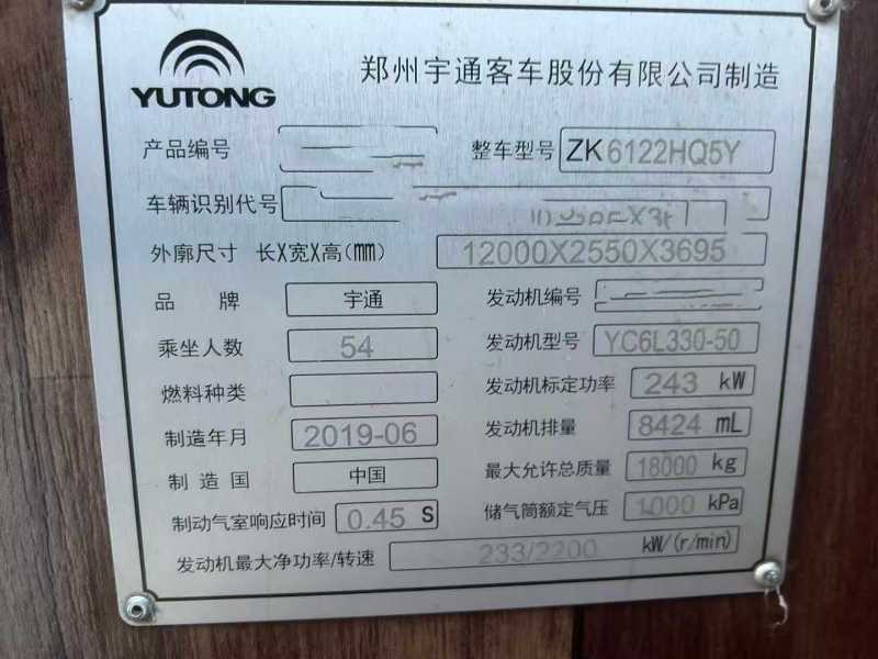 | 客车品牌 | 宇通客车 | 上牌时间 | 2019-07-17 |
