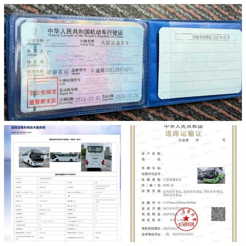 有公告50座宇通6120营运车,2024年2月上牌,燃油加热,锅炉暖气,定速巡航,多功能方向盘,底盘升降,省市际营运证,木纹地板,行李架,车内氛围灯,点歌机,司机独立驾驶室,旅游客运可提营运,有兴趣的来聊。