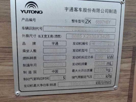 2022年6月上牌宇通6897,玉柴270国六发动机,气囊车, 缓速器,四轮碟刹免维护,锅炉,暖气,双层玻璃 燃油加热 全车USB充电口 重点有营运公告 ,正规营运档案,旅游客运可提营运,喜欢的来:
