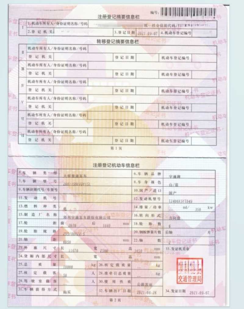 | 客车品牌 | 宇通客车 | 上牌时间 | 2021-09-23 |