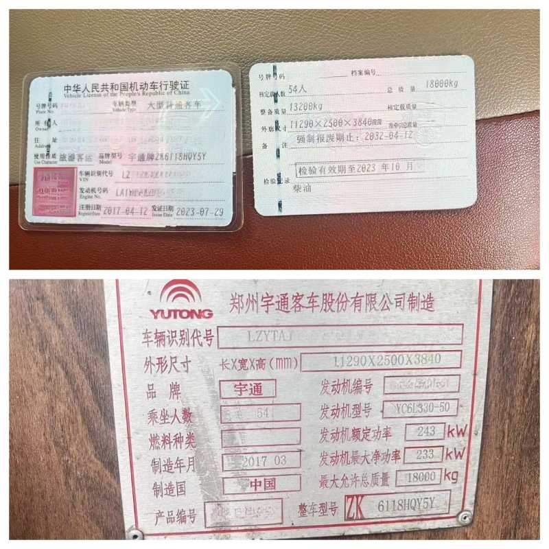 粤牌一层半国五54座宇通营运车,2017年4月上牌宇通6118,有中门,上移行李舱,司机睡仓,行李架,木纹地板,皮质座椅,玉柴330发动机,旅游客运可提营运,有兴趣的来聊。 本公司接受客车置换(国三国四国五,非营运,旅游客运,公路客运,公交客运都可以)。我们有着丰富的外迁内地城市经验。也可做正规出口手续。我们在广东省珠三角区域(深圳、广州、珠海、佛山、东莞、惠州)从事二手车数十年,全部是薄利多销的价格出售,不管是单台还是批量•均享受最诚信的合作态度。也可以根据您需要的指定车型来优选匹配,柴油.油电混合、新能源纯电动均可在珠三角区域看到现车,各种品牌都有,油车,新能源电车,油电混合,天然气客车等,可安排师傅代驾送车,或者物流配送发往全国。我们的宗旨:不但销售的车型丰富多元化,服务更是全方位:可视频看车定车,可代驾送车。另外本公司常年收购2座-55座客车,中巴、大巴都可以操作。 公司地址:1、深圳市南山区西丽街道曙光社区云家供应链有限公司宿舍101车友汇鑫汽车贸易有限公司 2、深圳罗湖区宝岗路1号淘车吧
