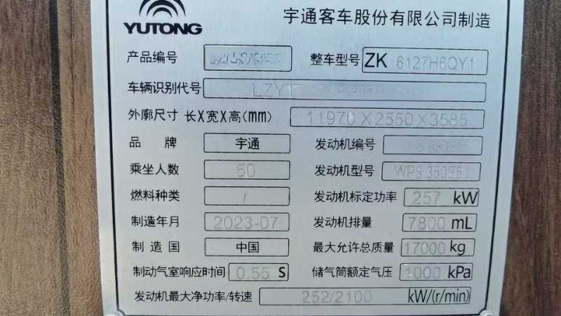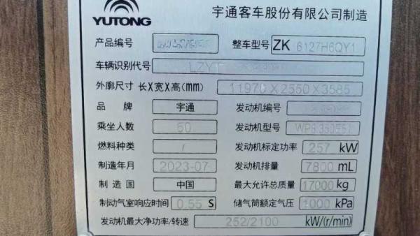 | 客车品牌 | 宇通客车 | 上牌时间 | 2023-08-22 |
