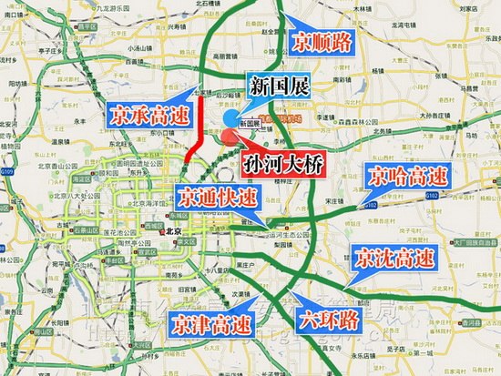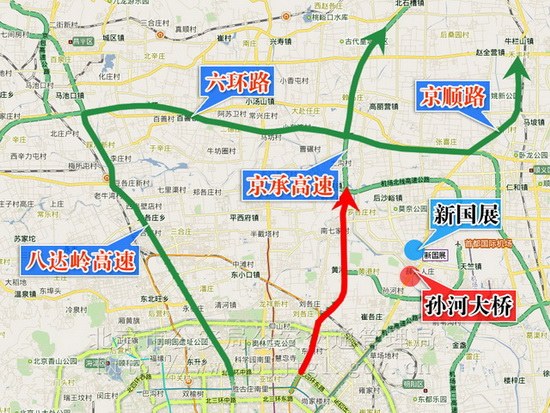 六、由于车展期间京承高速路车流量大,京密路孙河大桥路面施工,易造成交通拥堵。为避免过境车辆和前往怀柔、密云、平谷、承德等方向旅游车辆长时间滞留,可分别由下列道路绕行: