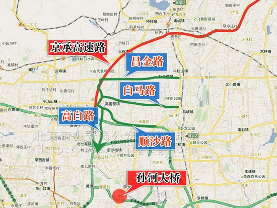 (四)由京密路方向进京的车辆,可分别由牛栏山路口绕行昌金路;由马坡桥绕行白马路;由西杜兰路口绕行顺沙路。