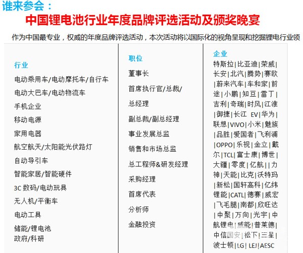 作为中国最专业,权威的年度品牌评选活动,本次活动将以国际化的视角呈现和挖掘锂电行业领域最具影响力品牌企业,主办方将全力推动锂电行业品牌发展。2017中国锂电品牌评选活动力求辐射全中国,影响全行业,全力打造中国最具影响力的和号召力的品牌评选活动,同期举办深圳国际锂电高峰论坛暨颁奖晚宴。