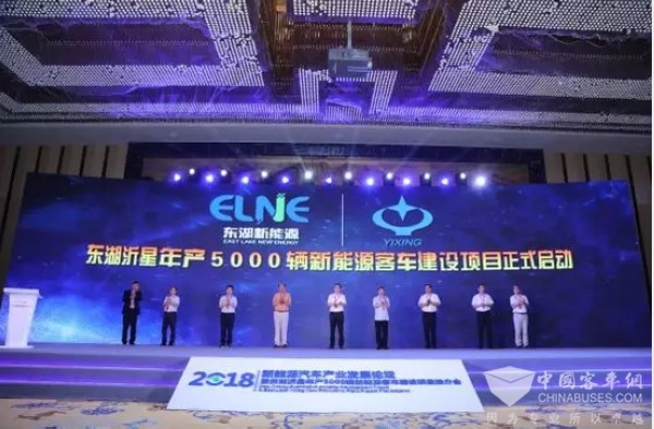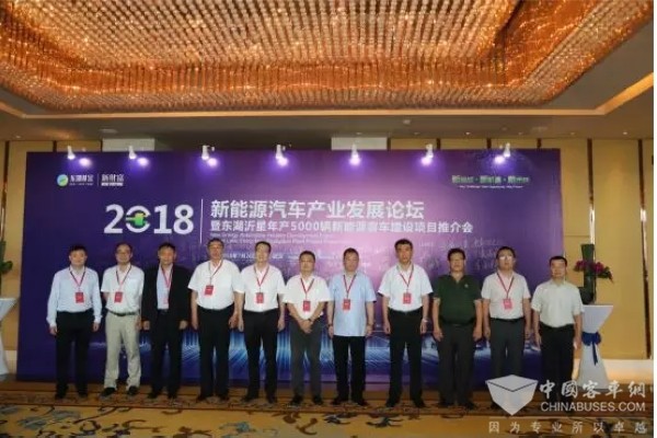 在2018新能源汽车产业发展论坛上,特邀嘉宾、东湖基金与东湖新能源还成功启动了“东湖沂星年产5000辆新能源客车建设项目”。该项目现已选址山东省临沂市高新区,占地747.82亩,项目旨在打造国内第一条以氢燃料电池客车为主的生产线,达产后,年可实现5000辆新能源客车的生产能力。