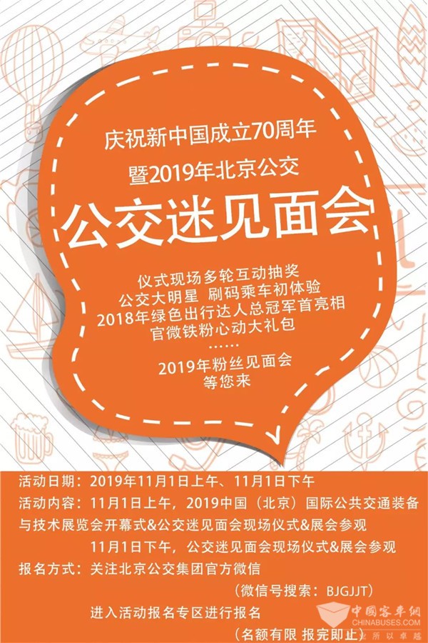 “2019 中国(北京)国际公共交通装备与技术展览会”会展期间,由北京公交集团官方微信举办的庆祝新中国成立70周年暨2019年北京公交迷见面会将同期举行。