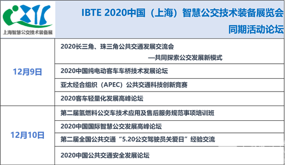 由城市交通网发起,中国土木工程学会城市公共交通分会、晟格会展(上海)有限公司共同主办的2020中国国际智慧公交发展高峰论坛,将与IBTE 2020中国(上海)智慧公交技术装备展览会同期举办,届时将全方位多角度展示最新智慧公交技术、智能网联产品和新能源公交特色。