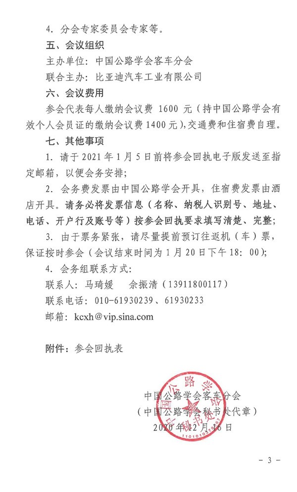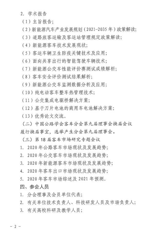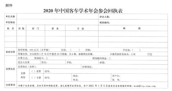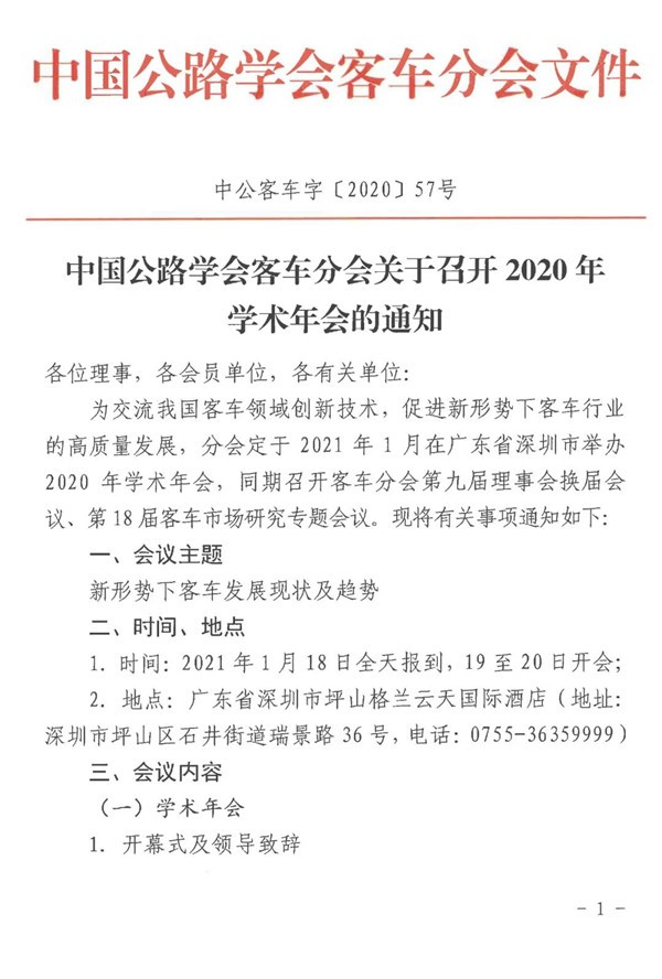 2020年12月17日,中国公路学会客车分会印发了《中国公路学会客车分会关于召开2020年学术年会的通知》,此次学术年会将于2021年1月19日-20日在广东深圳隆重举行(1月18日报到)。届时,中国公路学会的各位理事以及会员代表将光临现场,共同探讨新形势下客车行业发展的新思路。