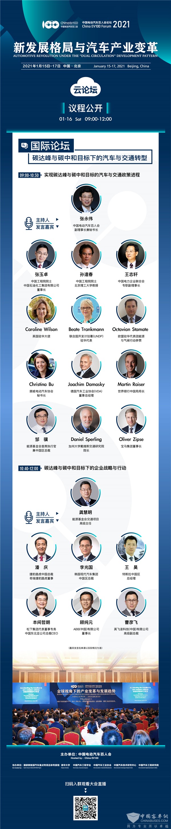 大会的第2天(即1月16日,周六)是本届论坛的重头戏,被誉为“产业发展政策窗口及风向标”的2场高层论坛将相继召开。上午为国际论坛,主题为“碳达峰与碳中和目标下的汽车与交通转型”,来自欧、美、日、韩等国际机构及企业代表将与中国新能源汽车产业代表,共同就汽车与交通产业在实现碳达峰与碳中和目标过程中的政策、企业战略及行动交换经验与观点。下午为高层论坛,主题与本届大会相同,即“新发展格局与汽车产业变革”,相关政府领导、企业代表与行业专家将深入探讨汽车产业正在加快形成的新发展格局之间的关系,新能源汽车应发挥的作用,下一步产业发展所面临的问题,需要的政策支持及政策落地等一系列问题。