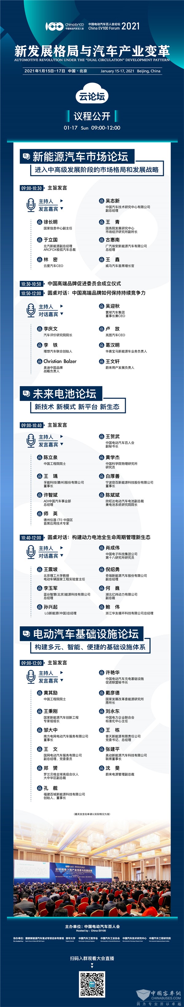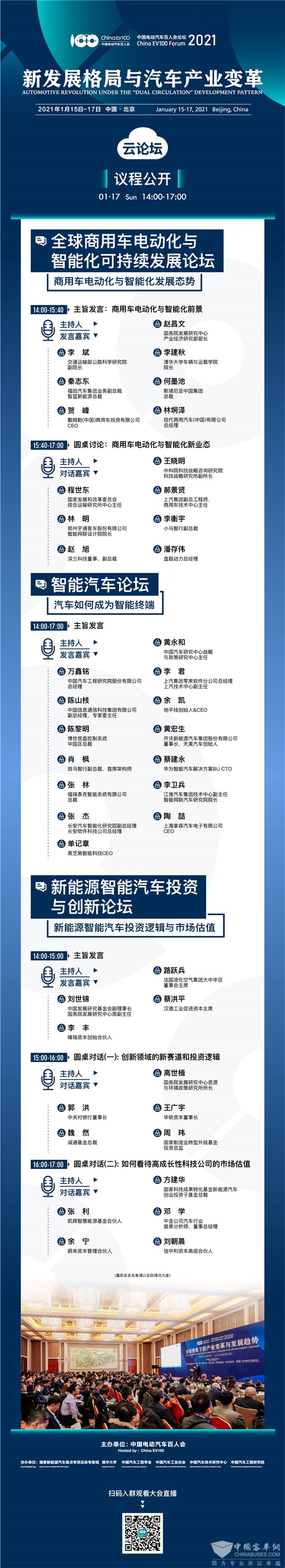 大会第3天(即1月17日,周日)将连续进行6场专题论坛,上午、下午各并行举办3场,全方面回应产业发展的热点、难点及重点问题,覆盖新能源汽车市场与消费、电动汽车核心零部件及关键技术、智能汽车、基础设施、商用车与投融资等议题,在主旨演讲之外,还将围绕“中国高端品牌如何保持持续竞争力”“构建动力电池全生命周期管理新生态”“商用车电动化与智能化新业态”“(新能源汽车)创新领域的新赛道和投资逻辑”“如何看待高成长性科技公司的市场估值”等话题,举办5场圆桌对话,近百位来自各领域的行业专家及领军企业代表将“现身说法”,给线上的各位观众呈上一场精神盛宴。