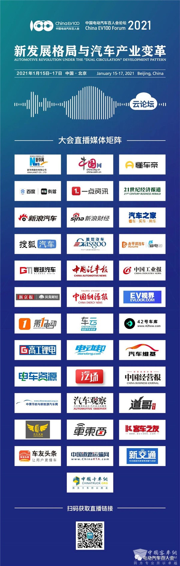 论坛期间,嘉宾可登陆中国电动汽车百人会论坛(2021)官方微站( 浏览器打http://79.meeting.chinaev100.com),或关注中国电动汽车百人会官方微信(ChinaEV100),可以第一时间获取大会直播链接。