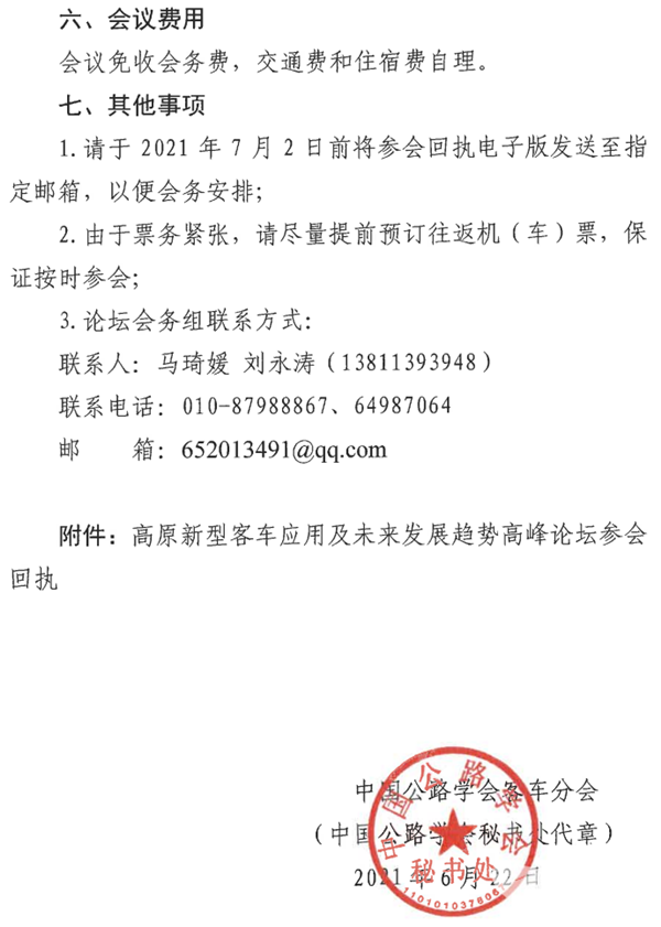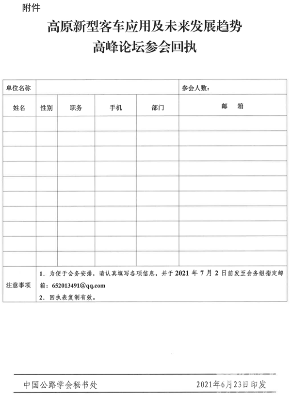 2021年6月23日,中国公路学会客车分会印发“关于举办高原新型客车应用及未来发展趋势高峰论坛的通知”显示,以“推动高原新型客车安全绿色发展”为主题的高原新型客车应用及未来发展趋势高峰论坛将于2021年7月8日在北京举办。