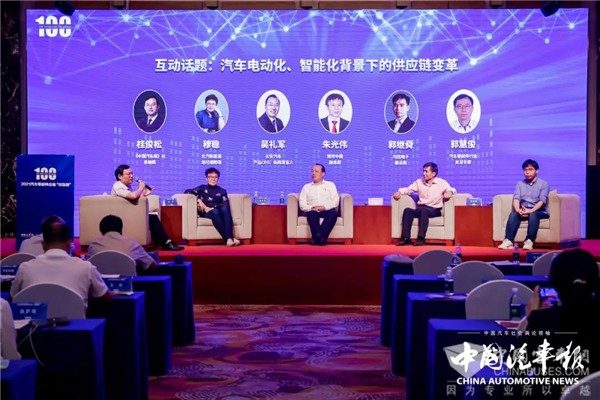 双百强发布会现场,中国能源汽车传播集团董事、副总编辑兼《中国汽车报》社总编辑桂俊松主持了“汽车电动化、智能化背景下的供应链变革”圆桌论坛,北汽新能源总经理助理穆稳、重庆长安汽车产品CE0兼新闻发言人吴礼军、博世中国副总裁朱光伟、均胜电子副总裁郭继舜、汽车零部件行业资深专家郭慧俊共同探讨了汽车新四化发展下,整个供应链变化以及企业应对方向。