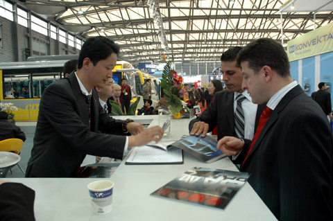 根据统计,13日一天和14日上午,大金龙共计发放资料超过1500份,尤其是14日上午前来所取大金龙展车资料的人络绎不绝,相比往届车展有较大幅度增加,是历史上现场接待客商人数最多的一次,其中有1/4左右为海外客商。再加上其他参观者,本次大金龙展台汇聚了海内外的超强人气,不愧为BAAV2007的"人气王"。大金龙从公司高层到业务员和现场接待人员无不应接不暇,洽谈业务、接受采访、分发资料、引导参观、车型讲解……这其中,大金龙成功蝉联展会最高荣誉--年度客车大奖有着巨大的推动作用。据随机访问得知,前来参观者中不少人就是慕"年度客车大奖"之名而来,他们纷纷在本届车展的明星--大金龙XMQ6129Y身旁合影留念,留下值得纪念的镜头。