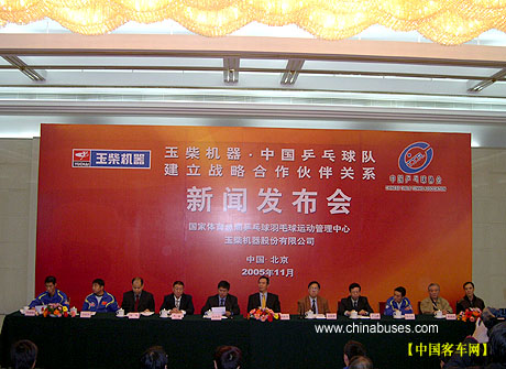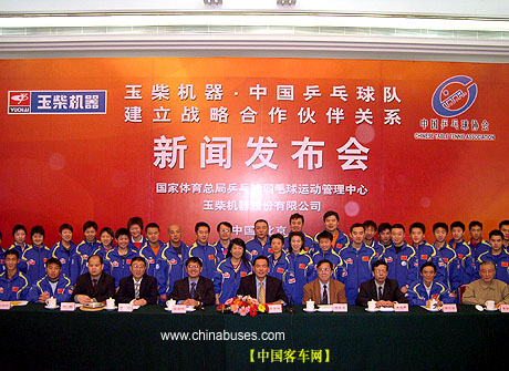 在新闻发布会上,玉柴机器副总经理吴其伟表示,中国乒乓球队是一支家喻户晓的体育团队,深受中国老百姓的喜爱。中国乒乓健儿凭借坚定不移的意志,坚强不息的拼搏精神,顽强的在国际赛场上取得了多项冠军,为祖国和人民赢得了无数荣誉,每一块金牌的过程,每一场激动人心的比赛,无不激发起炎黄子孙的爱国热情和民族自豪感。玉柴机器作为我国一支优秀的民族企业,已形成为国内最大的内燃机生产基地。2003 年,玉柴实现产销柴油机17.5万台,在独立核算的商用车柴油机生产企业中,跃升为全球第一,在中国企业500强中排名第334位。2004年玉柴集团拥有总资产70多亿元,销售收入超过107亿元,居全国同行业之首。2005年玉柴集团位列中国企业500强排行榜第231位,并获得了全国质量管理奖、"中国名牌产品"等荣誉称号,秉承着"人为本,争第一,零起点"的企业精神,用卓越和领先满足公众的动力需求,积极努力进入国际内燃机行业的前四强。由于在精神追求上的一致,成为了双方能够走到一起建立战略合作伙伴关系的坚实基础。