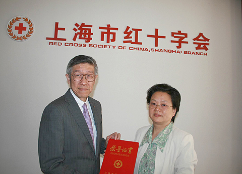 左-普利司通轮胎事业中国地区总裁竹内雄二,右-上海市红十字会副会长孙大红 |