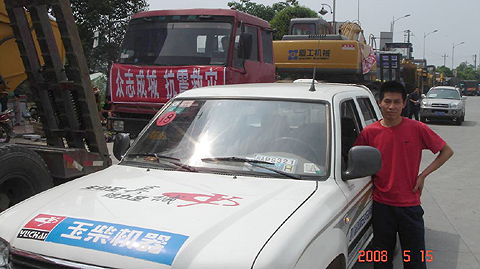 随着震区救灾工作的展开,我们发现灾情比想象的更为严重,需要工程机械和运输车等机械化作业工具的援助。成都柳汽总代理金安公司援助的一批运输车,打算今天进驻灾区,为跟随金安公司到灾区去抗震救灾,我们一早就准备好玉柴广告衫和广告伞。这时,接到办事处廖远耕主任的通知,厦工组织十多台装载机到重灾区北川支援,主要配装玉柴YC6M发动机,安排我组织人员配件物资等共同参与抗震救灾。