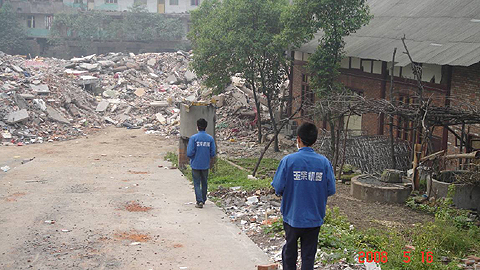绵竹汉旺镇是德阳绵竹灾情最严重的乡镇之一,三分之二的房子倒塌,灾民已经被安置到难民接待点或接送出去治疗。镇里面大部分是解放军战士、武警和救援人员。由于这两天天气热,没有来得及清理的城市垃圾发出腐烂的难闻气味,有些死难者尸体挖出来后都已经腐烂,救援人员边挖边消毒,广播也不断提醒,要做好大灾后的防疫工作,这对我们在现场的工作是一种严峻考验。