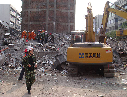 下午,接指挥部通知,中国银行职工住宿楼还有人埋在里面,要出动2台装载机到绵竹市城区协助作业。于是,2台装载机先出发。