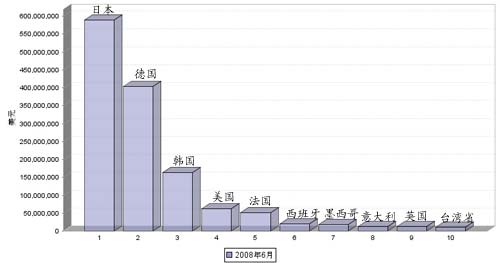 08年6月我国汽车零部件产品进口国TOP 10(以金额计)