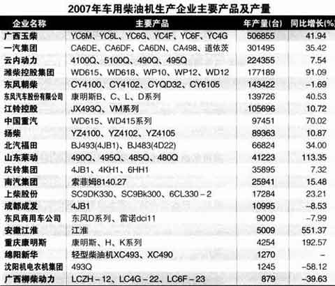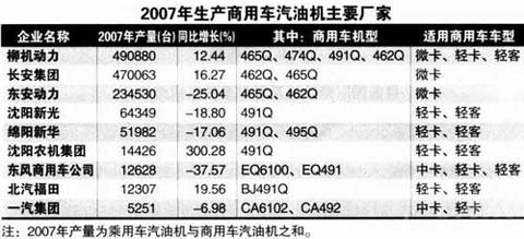 2007年,汽车用柴油机生产239.8万台,扣除一汽-大众生产捷达轿车用柴油机(18659台)及SUV(23139台)和MPV(2572台)用柴油机及微客用柴油机384台,全年共生产商用车柴油机235.3万台,同比增长23.8%。2007年共生产汽车汽油机601.0万台,其中商用汽车用汽油机约48.77台,同比增长13.0%。