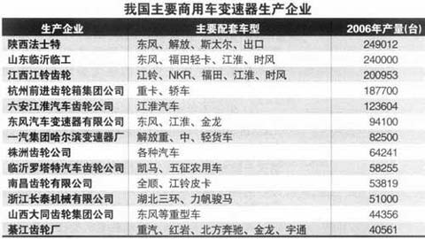 2007年我国生产商用车变速器约2857台,同比曾长21.6%。2007年商用车增幅较大,因此商用车变速器增幅也较大。其中由于2007年重卡增长76.6%,大客车产量增长46.3%,半挂牵引车增长95.6%,货车底盘增长32.8%,因此重型汽车变速器的增幅也较大,一些企业的出口量也较大(如法士特重型车变速器)。